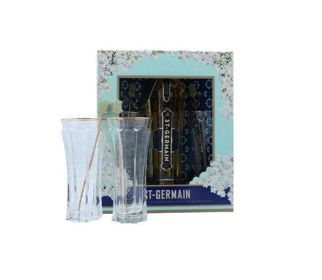 Pack includes, x1 St Germain Elderflower Liqueur 500ml, 2 glasses and 2 stirrers in gift box.